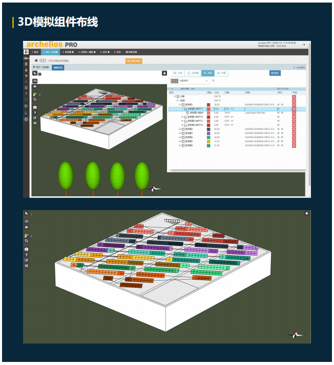 在规划设计阶段,三维设计与仿真技术能够帮助工程师对储能电站的选址、布局进行优化。通过地理定位,获取当地气象数据,结合卫星地图描绘建筑和光伏排布进行三维建模,计算阴影损失,预测高精度发电量 。例如利用 archelios 软件,能内置全球 8500 多气象站数据库,基于卫星地图进行三维建筑、车棚、地面及光伏排布建模,实现光伏组件智能排布 。这种精准的设计能够有效提高储能电站的发电效率,降低建设成本。