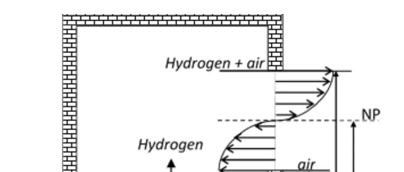 中性面(NP)是一个水平面,在该面上,封闭空间内部和外部的压力相等。在一般情况下,对于通过释放比空气轻的气体进行被动通风的封闭空间,中性面位于通风口高度的一半或以下,以保持稳态条件。在NP以下,空气进入封闭空间,而在NP以上,较轻的氢气-空气混合物逸出封闭空间(图1,左)。图1-当中性面位于通风口下边缘和一半高度之间时,通风口的流速。在完美混合的假设下,开发了一个关于封闭空间中单个通风口持续气体泄漏的被动通风模型,该模型由(Eq.1)描述,并报告在(Molkov等人,2014)中。g′=ρair−H2密度按(kg/m³)计算,其中p是环境压力(Pa),M是气体的分子质量(kg/kmol),T是环境温度(K),R=8314.4是通用气体常数(J/K/kmol)来源:气瓶设计的小工程师
