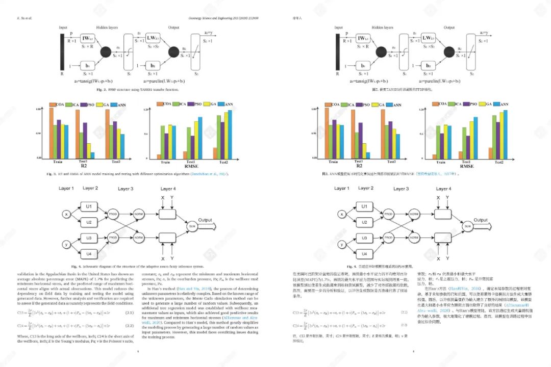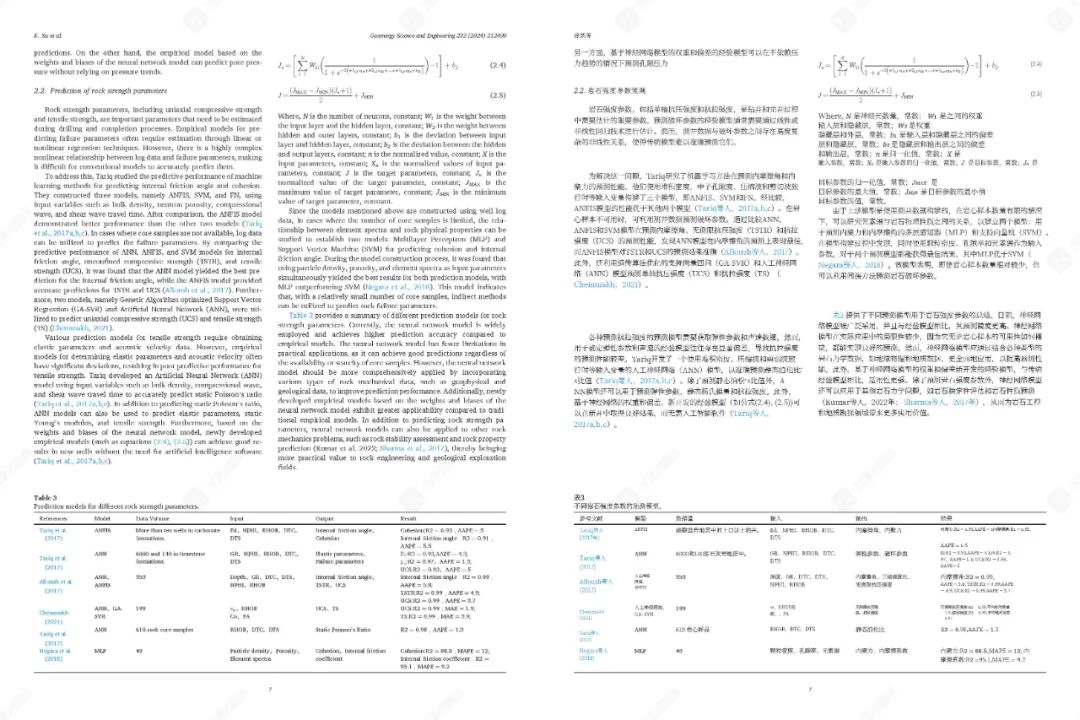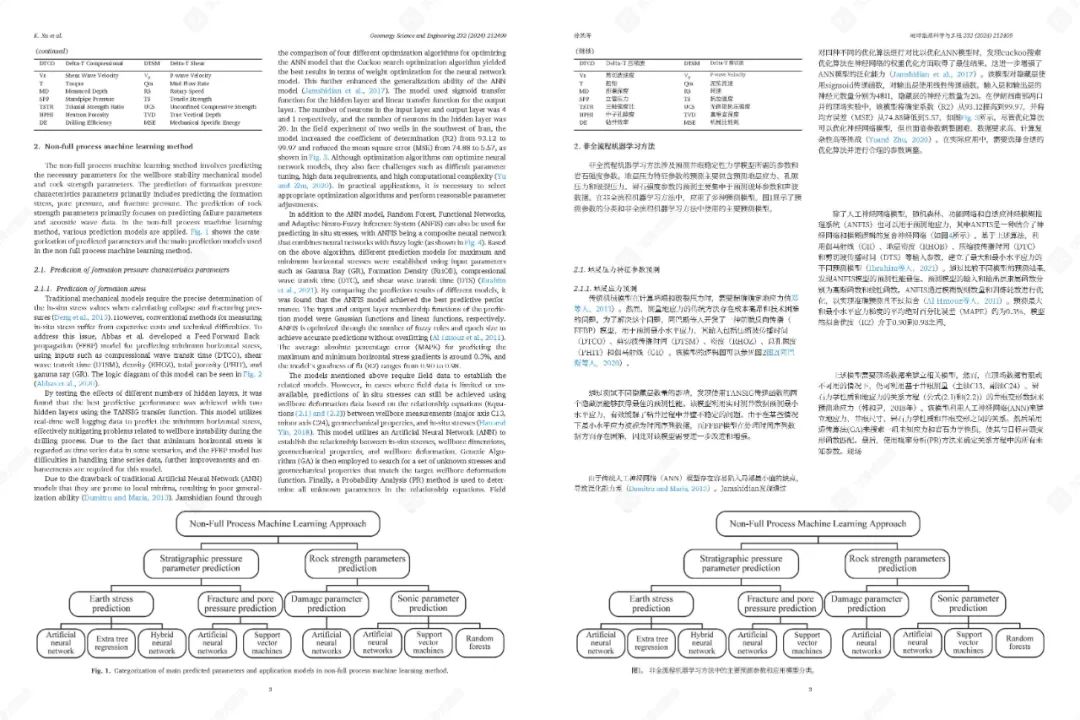 非全流程机器学习方法用于预测井筒稳定性力学模型的参数和岩石强度参数。它包括预测地层压力特征参数、岩石强度参数和声速。使用了不同的预测模型,如神经网络、随机森林和自适应神经模糊推理系统(ANFIS)。每个模型都有其自身的特点、优点和局限性。例如,神经网络模型应用广泛,但存在易陷入局部最小值和过拟合等局限性。3. 全流程机器学习方法