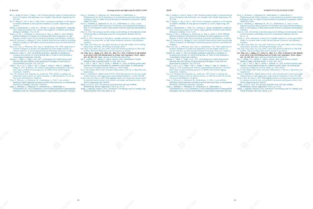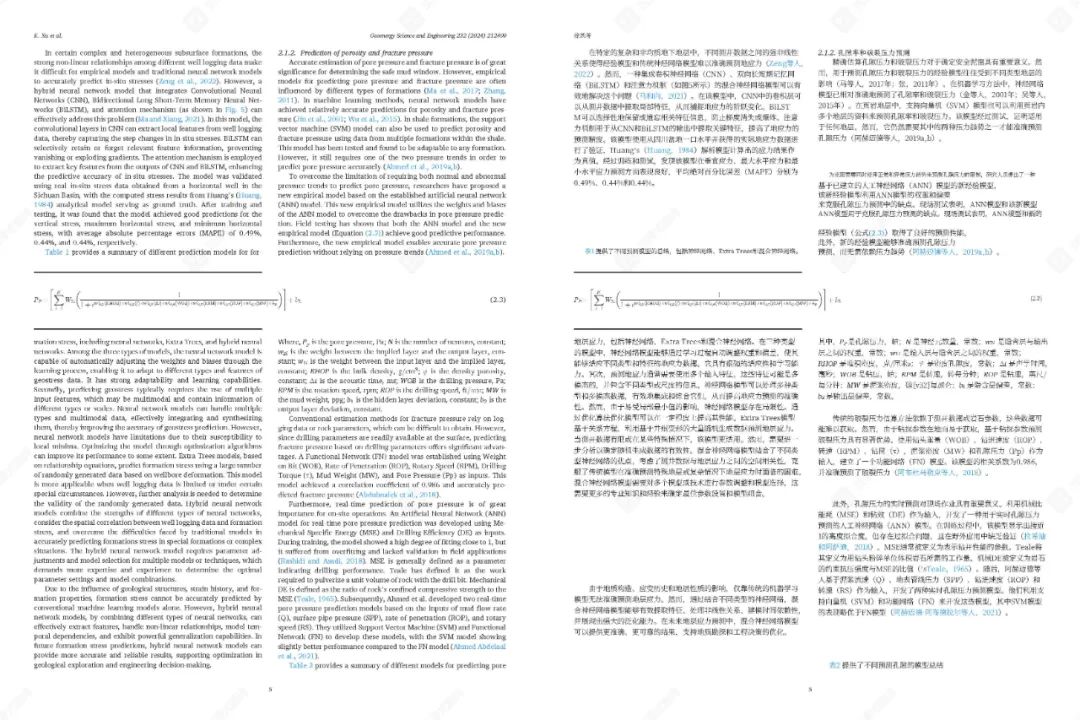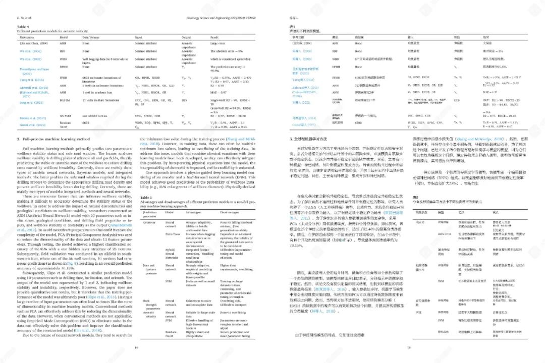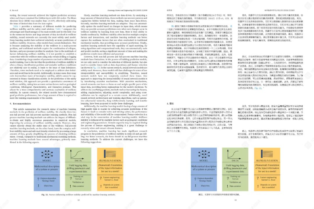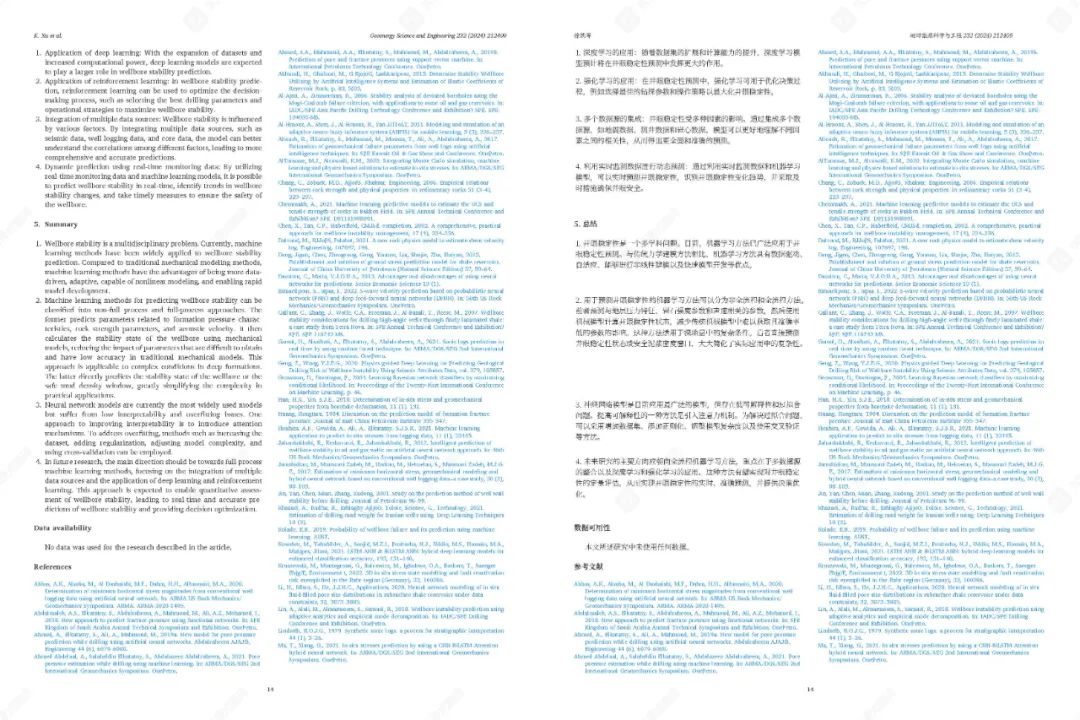 机器学习方法在井筒稳定性预测中具有数据驱动、自适应、处理非线性和快速建模等优点。然而,它们也存在局限性,如神经网络模型的可解释性低和过拟合。为了解决这些问题,可以采用引入注意力机制和增加数据集等方法。未来的研究应专注于全流程机器学习方法,包括深度学习、强化学习的应用,整合多个数据源以及使用实时监测数据进行动态预测。5. 总结