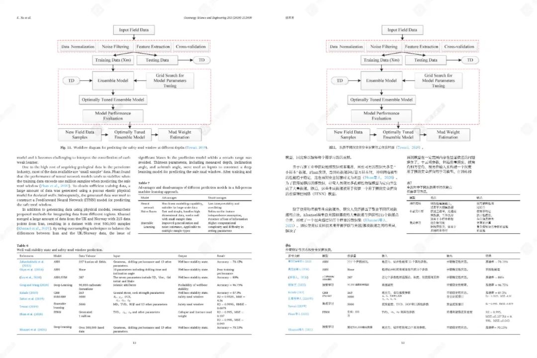 全流程机器学习方法主要用于预测井筒稳定性状态和安全泥浆窗口。对于预测井筒稳定性状态,使用神经网络、贝叶斯模型等模型。对于预测安全泥浆窗口,主要使用集成方法和神经网络。每种类型的模型都有其自身的性能和局限性。例如,神经网络模型被广泛使用,但面临数据需求高和类别不平衡问题等挑战。4. 建议