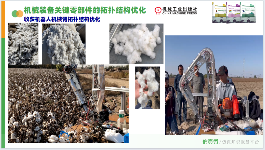8月27日19时,我们诚邀新疆大学教授、石河子大学特聘专家买买提明·艾尼老师做《现代装备设计与ANSYS Workbench数值仿真技术》 线上讲座,艾尼老师不仅会介绍收获机器人机械臂拓扑结构优化过程、还包括燃气轮机支承板机座拓扑结构优化与热流固耦合、棉花输送管道流固耦合分析、农田轨道谐波响应分析、飞机双耳接头粉末床熔融增材制造分析等具体应用案例。这些案例来自艾尼教授最新编著图书(见下图),直播间会免费抽赠以下图书。以下是直播安排: