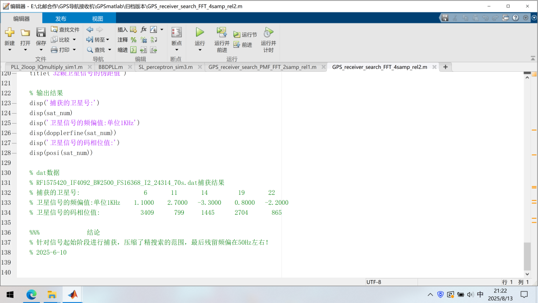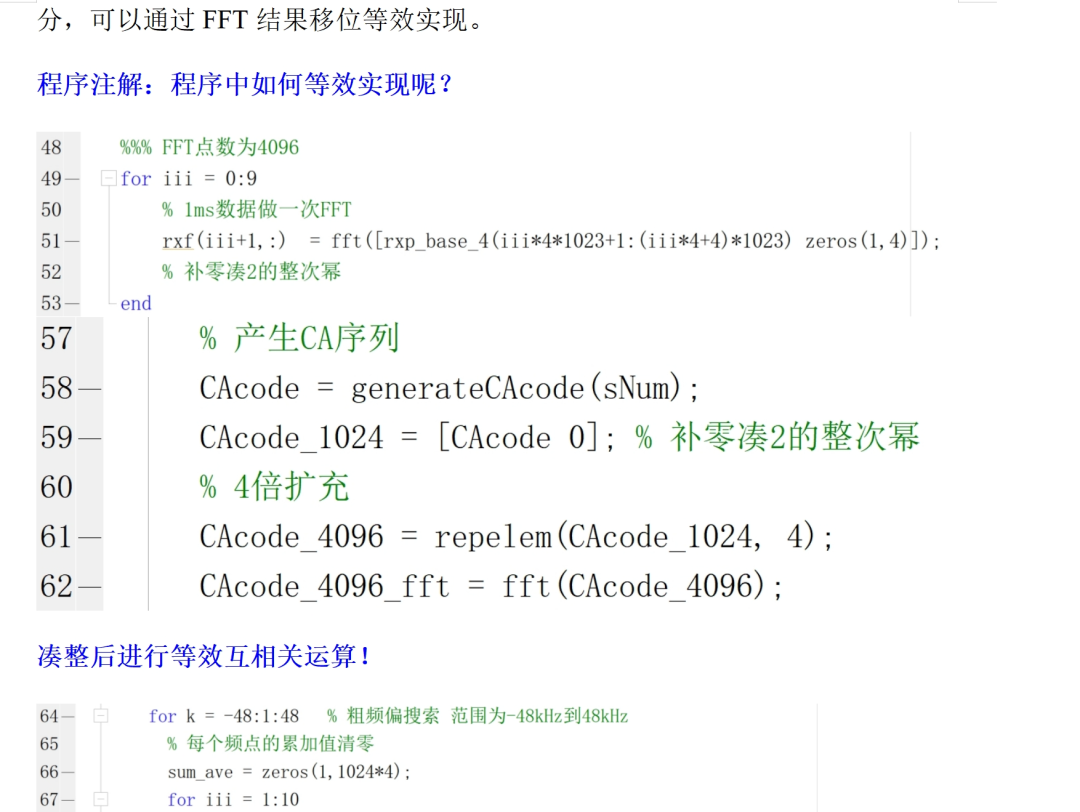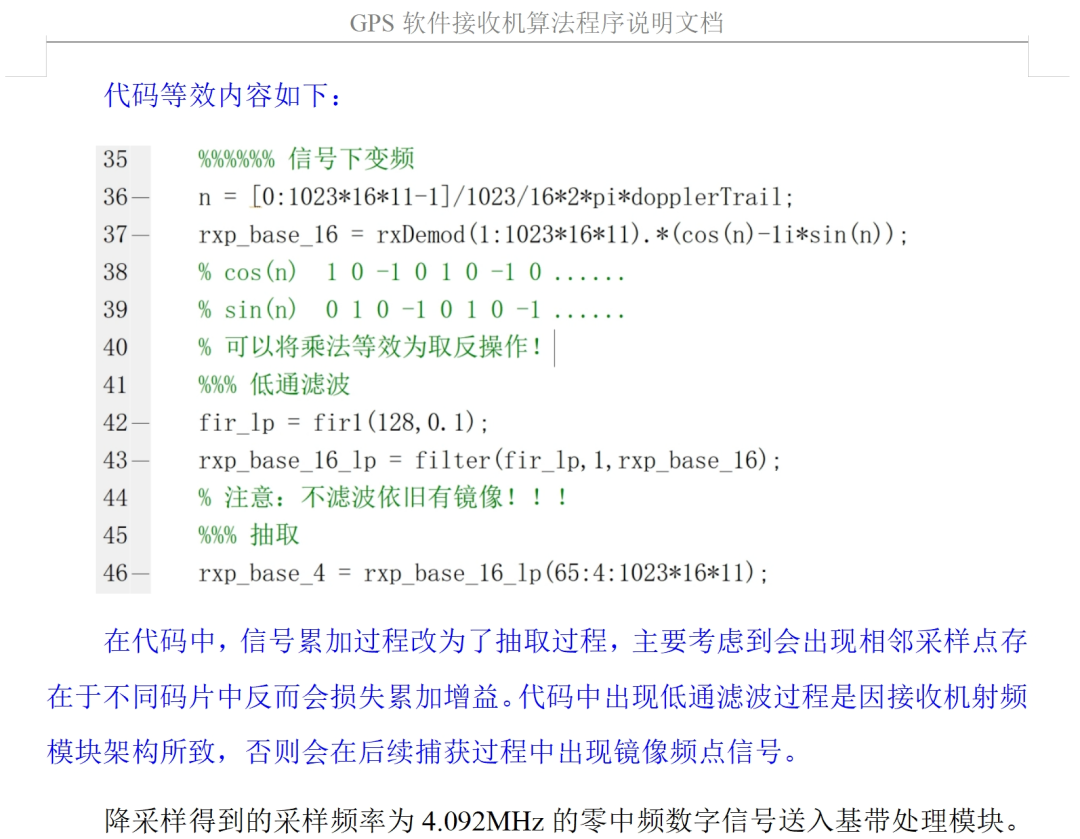展示核心知识点对应的部分代码!这个项目属于对外合作,中间还发生了一大堆的插曲。最开始的插曲就是在这个捕获代码里面发生的,厂家不认为他们的信号存在着混叠问题,于是我在最开始写代码的时候就没有考虑到信号混叠效应,进行了相关的处理以后,发觉捕获的时候老是结果出错,为什么认为捕错了呢?因为捕获的结果(频偏和码相位值)输入到跟踪模块以后,无法 正确解调出结果,就在这个问题让我的工作一个星期没有任何进展。在这一个星期时间里面,我做了多种比对,最后认定这个信号在变频以后如果没有进行滤波,一定会造成频率的折叠。那如果在中频信号AD采样之前加入一个很好的滤波器,会不会有混叠呢?也会有混叠,但是捕获过程可以通过解扩操作把混叠信号给去除。加了滤波器之后,捕获结果就不会把信号的负频偏变成正频偏,不然就会导致负变正!!!通过对信号进行多种算法测试和结果比对,在事实面前,厂家才承认存在这个问题。