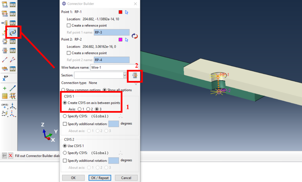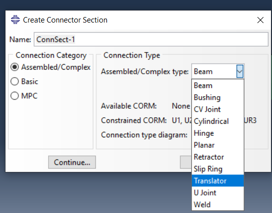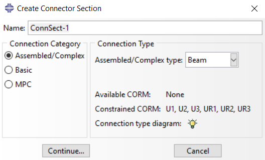 在上述图中,首先用户必须创建一个坐标系并选择一个与连接器平行的轴。其次用户必须选择连接器部分。如果它不存在,必须创建。在下一个图中显示选定的“连接类别”是“组装/复杂”,而“连接类型”是“梁”。