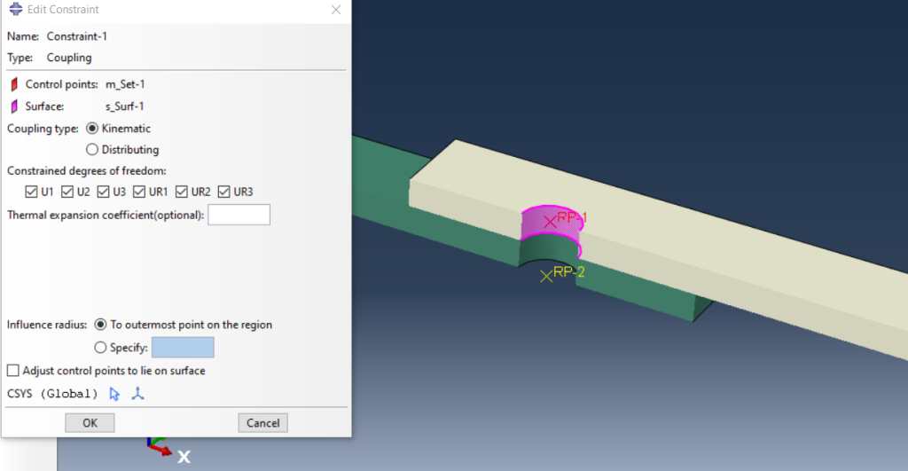 此耦合必须是运动学耦合(RBE2);然而,选择分布是可能的,但计算成本更高。