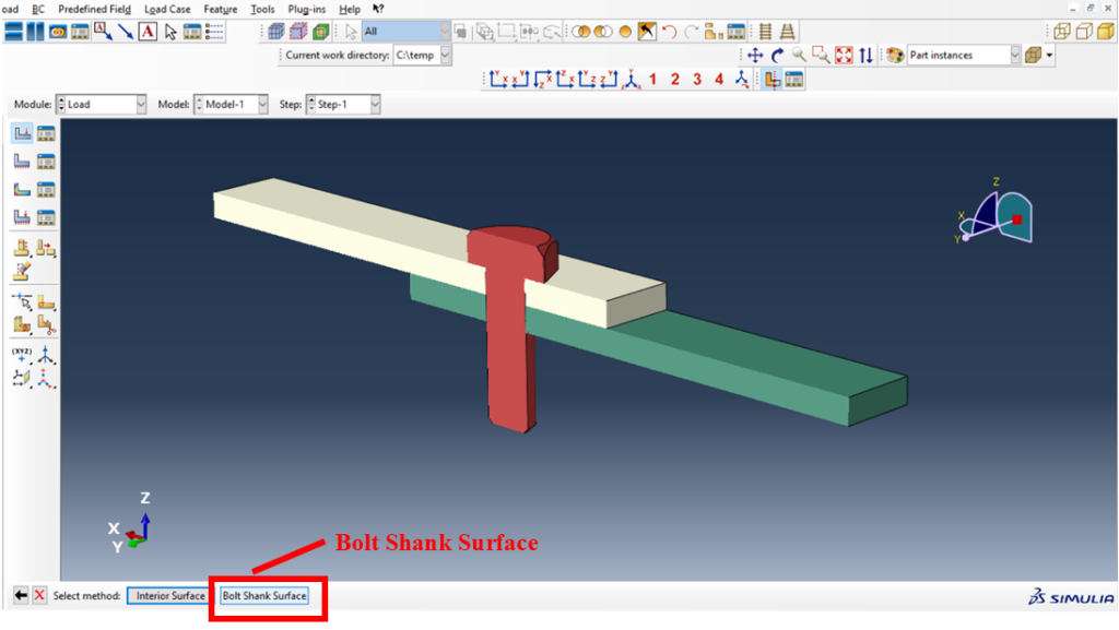 在设置螺栓与表面之间的交互后,使用此方法的第一步是在载荷模块中施加螺栓载荷。