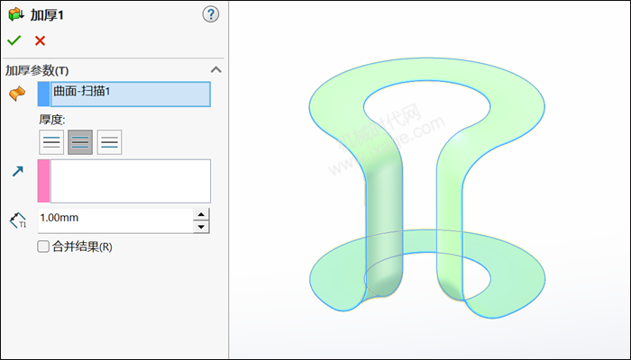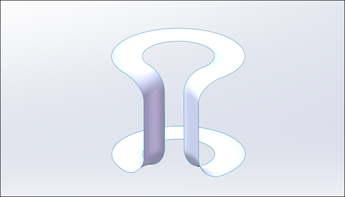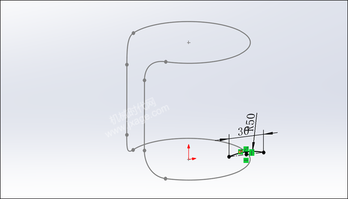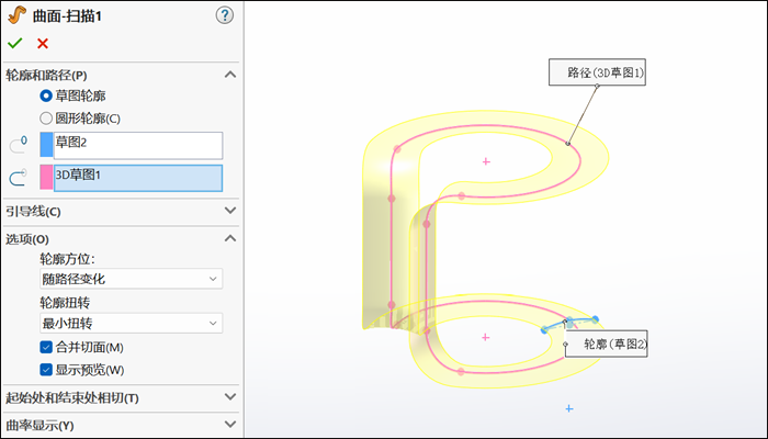 6.点击“插入”-“曲面”-“扫描曲面”,选择下图粉红色的3D曲线作为扫描的路径,选择草图3作为扫描的轮廓,如下图所示。