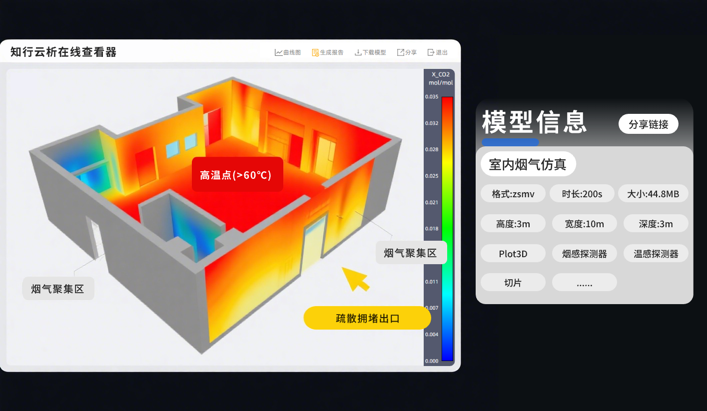 对建筑设计师而言,上传仿真结果后,不用再对着密密麻麻的表格分析消防设计问题。系统会用三维视图展示出关键:哪里烟气聚集、那里温度过高、哪个出口疏散拥堵……一目了然。想和团队讨论?生成一个分享链接,对方打开链接就能查看,设计优化方向清晰可见,沟通效率显著改善。