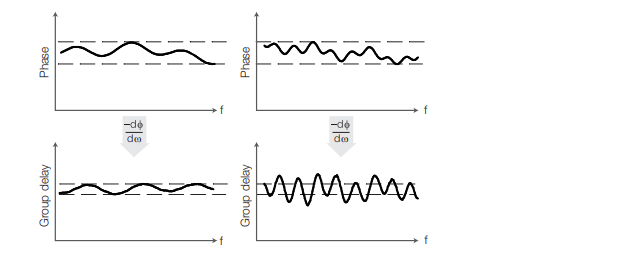 相位失真可以用另一个数据来表示——群时延。群时延表示的是信号通过系统的某频率处的相位(相移)对于频率的变化率。带信号经过媒质传输路径或设备中的线性元件时,其各个频谱分量的相速不同,元器件对各频谱分量的响应也不一样,这都会引起到达接收端的信号因各频率分量的相移或时延不同而产生相位关系的紊乱,即相位失真。