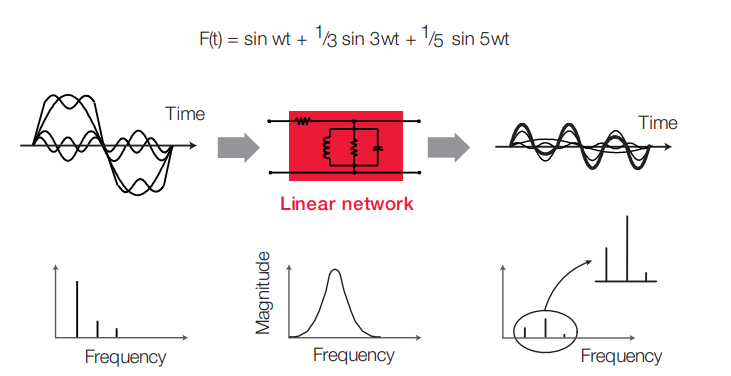 对于无线性失真传输,DUT的幅频响应必须是平坦的,并且相位必须是线性的。比如说方波(方波从频谱上看含有丰富的谐波)经过带通滤波器,带内对所选的频率衰减很小,同时相位是线性变化的。(图下图所示)