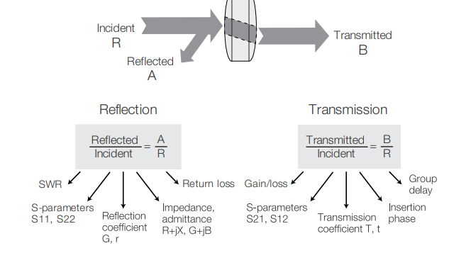 矢量网络分析仪通过对参考通道R的入射波的测量。用A通道测量反射波,用B通道测量发射波。观测波中的幅度和相位的信息,可以量化被测器件的发射和传输特性。