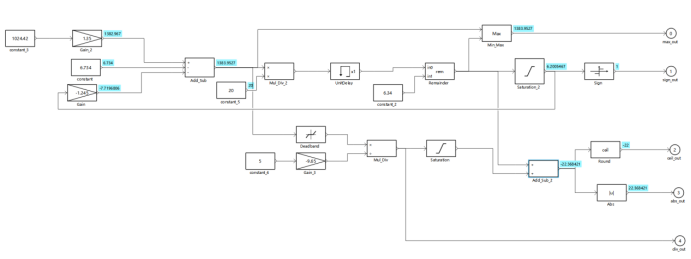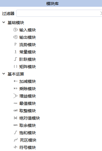 由图2和图3可知,目前支持自动生成Verilog代码的基础模块有输入输出模块,常量模块,加减模块,乘除模块,增益模块,最值模块,取整模块,绝对值模块,取余模块,饱和模块,死区模块,符号模块,积分模块,微分模块,延迟模块,位转换模块,多条件表达式模块,零阶保持,斜坡函数,斜率限制函数等。