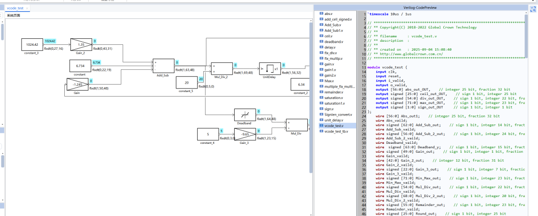 由图7可知,GCKontrol软件自动生成Verilog代码后,支持在界面对生成的代码进行在线预览,方便在模型级随时查看自动生成的Verilog代码。