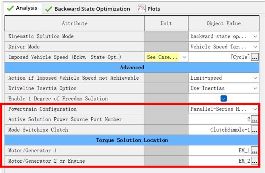 如下图所示,在车辆运动学模板(VehKinemAnalysis)中,首先要选择动力总成的架构形式(Powertrain Configuration),本文选择串并联。用户还可以选择动力分流模式(Power-Split Hybrid)和其他(Others)。其中Others包含比如P2,EV等架构。当选择串并联架构时,用户需要指定用于模式切换的离合器部件名称,以及两个电机的部件名称。