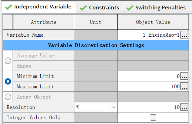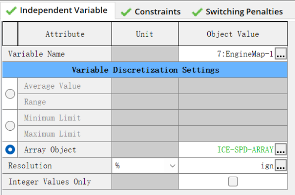 发动机的转速点扫略(ICE-SPD)。该扫略仅仅在串联模式才会发生作用。并联时,发动机的转速由车速决定。