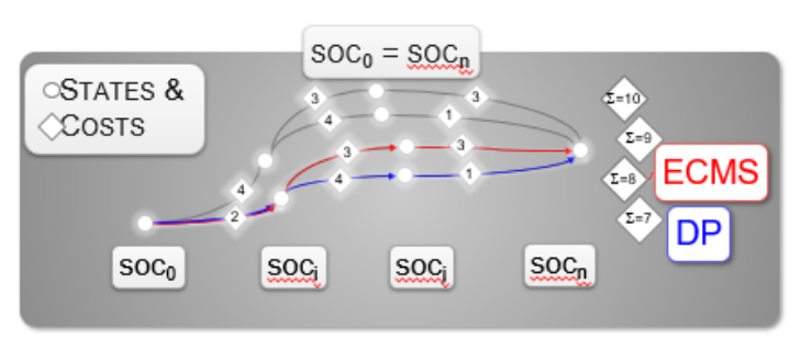 随着车载控制器算力的持续提升以及高级驾驶辅助系统(ADAS)的广泛应用,多种先进的控制策略已逐步应用于量产车型的控制器中。其中 特别以ECMS(等效“燃油”消耗最小化策略)和MPC(模型预测控制)为主要代表。ECMS 作为极小值原理(PMP)中协状态方程退化后的版本,从全局最优退化成了局部最优。虽然只是局部最优,但ECMS具有实时性强、相对简单的特点,在整车动力性经济性中应用较多。