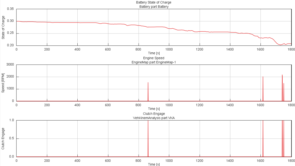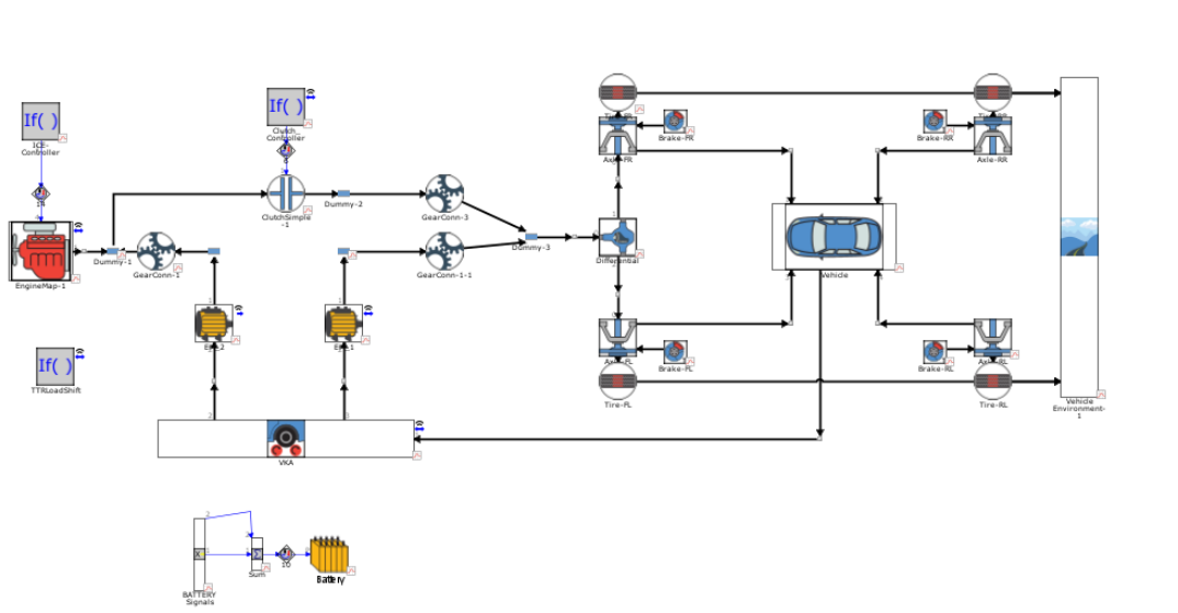 串并联插电混动相对复杂一些,既可以工作在增程模式,也可以工作在混动模式。对于ECMS来说,这两种模式的动力学模式差异显著。在建模过程中需要在GT-SUITE中进行特别设置。下图为本文所用串并联的插电混动模型,共两个电机。通过ECMS等最优控制算法,用户可以得到在给定工况下的模式分配规律,以及每一种模式下的发动机、电机的工作点等关键信息。
