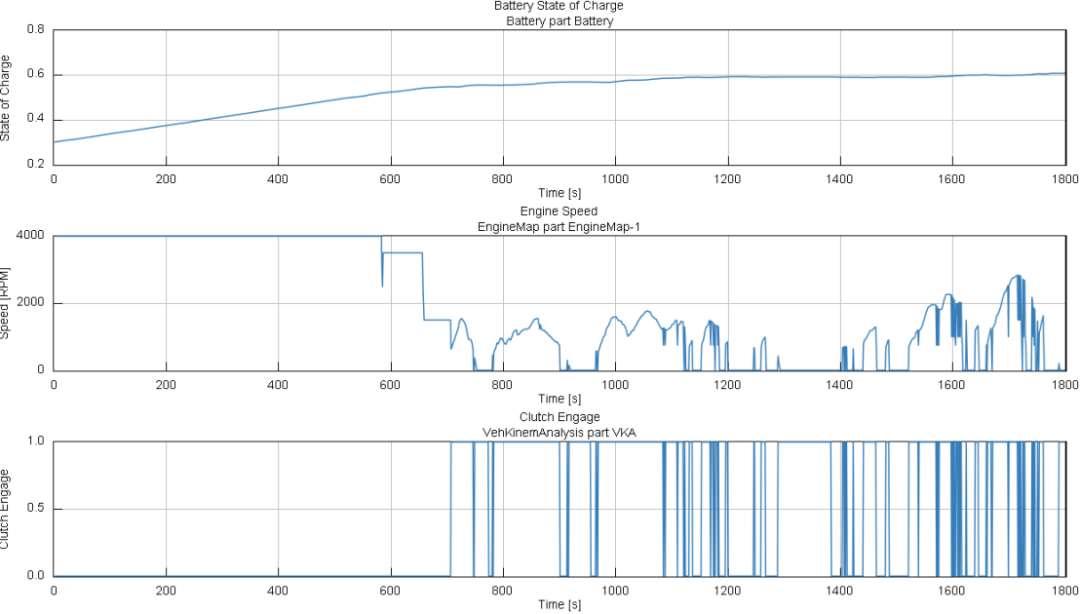 当等效因子为10时,在前600s工作在增程模式,离合器断开。600s之后增程、混动、EV都存在。由于我们并没有对发动机的启停进行惩罚,进行惩罚后,将会大大减少不同模式的频繁切换。