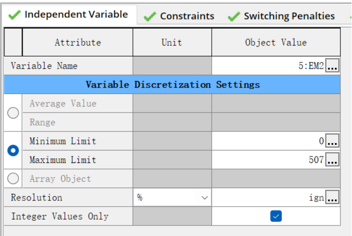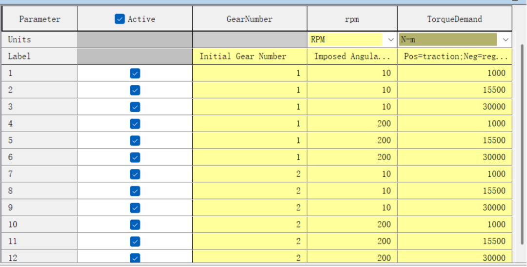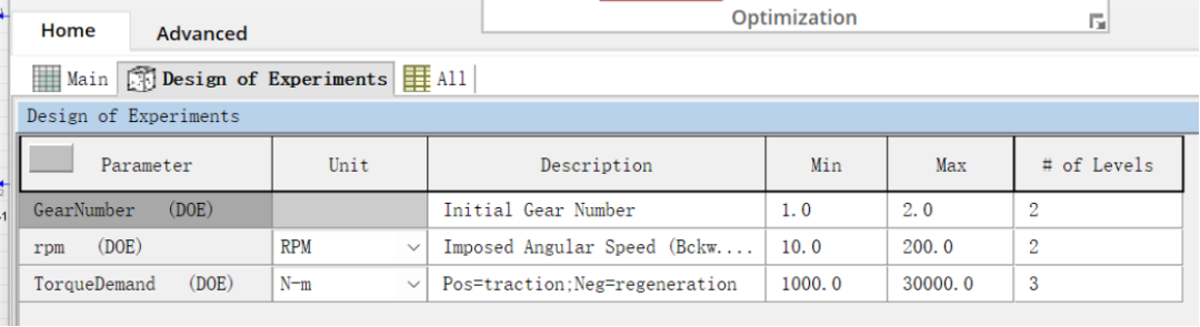 将减速器档位、减速器输出端转速和扭矩作为自变量,生成 DoE。本例故意将扭矩需求设置的很大(e.g. 30000Nm),以致超出电机外特性