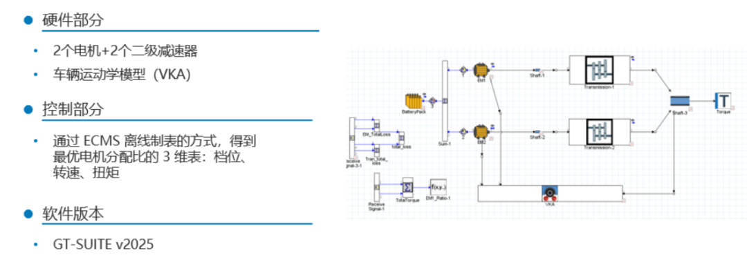 GT-SUITE的ECMS算法支持各类混动架构,如串并联、功率分流、增程、并联、多电机EV等等。本文将介绍ECMS的一种特殊应用,即离线地生成最优控制map。本文以一个EV车的动力架构为例,其包含两个电机和两个减速器。通过ECMS获得最佳电机分配比例。