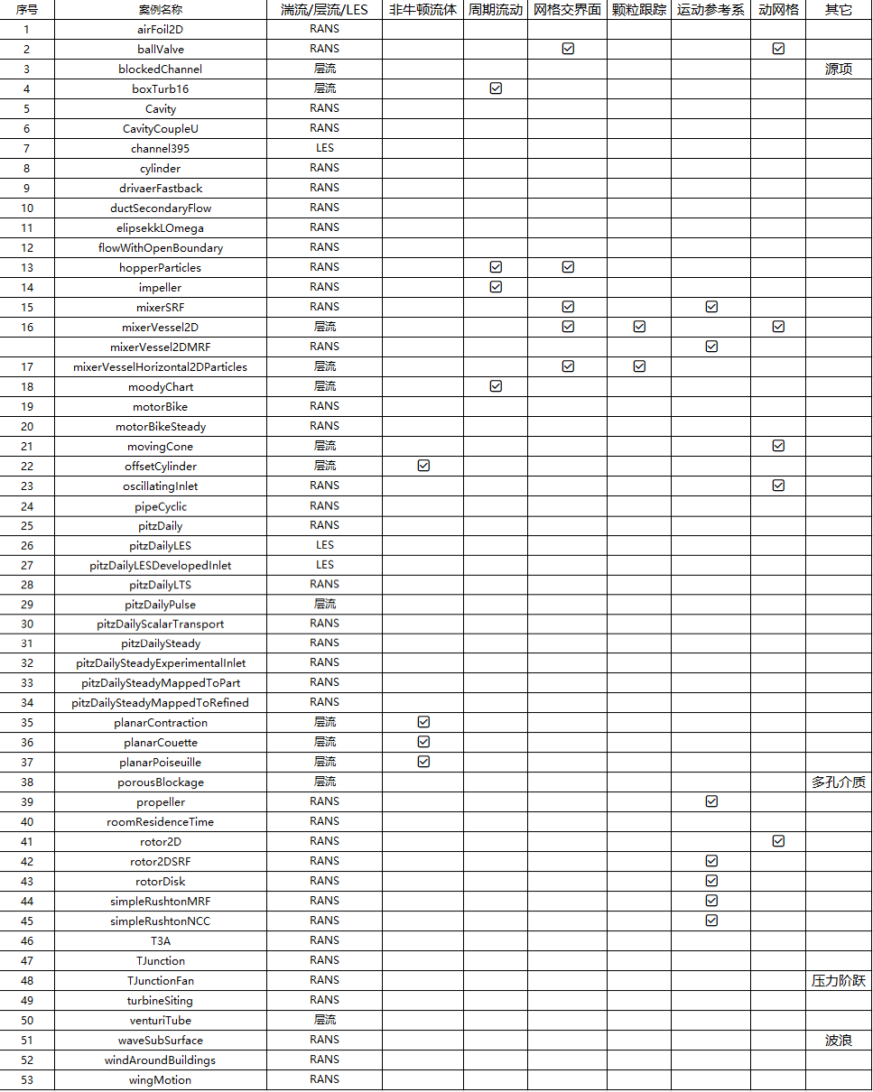 自从OpenFOAM v11版本使用模块求解器之后,其随机示例的组织形式也发生了较大的变化,目前OpenFOAM v13的incompressibleFluid提供了53个示例,这些示例中涉及到的物理现象包括: