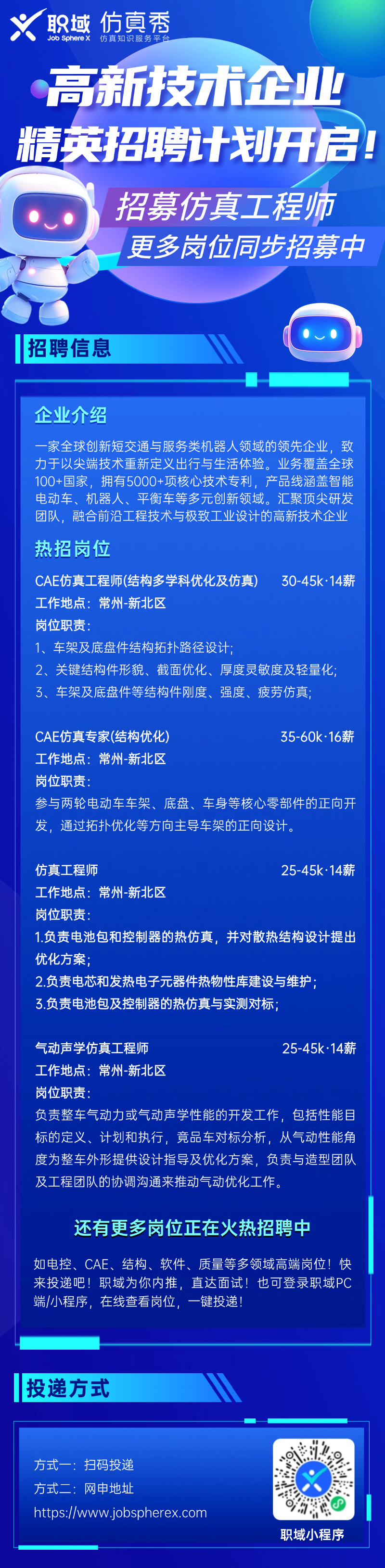 这次招聘信息的发酵,不仅让大家看到了行业内优质岗位的吸引力,也让仿真秀社群的交流氛围变得更加活跃,成为了一次兼具职业机会分享和行业趋势探讨的热闹交流活动。本期仿真秀职域平台给读者带来以下2个岗位,欢迎工程师朋友联系我们内推,也欢迎国内外企事业单位HR和技术负责人可通过仿真秀职域平台发布招聘研发工程师需求。