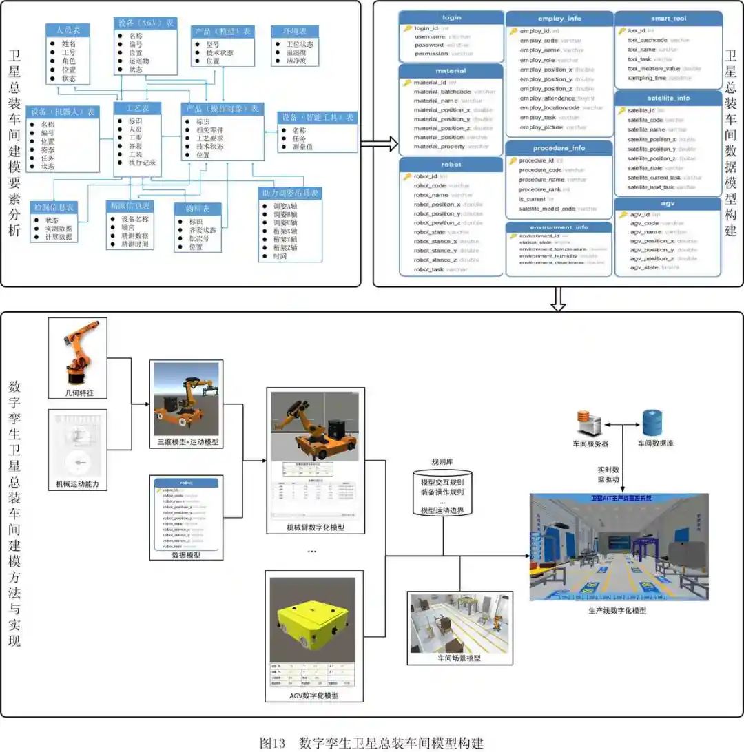 在数字孪生卫星总装车间模型构建上,对数字孪生卫星总装车间建模方法进行研究,并以验证生产线为例构建车间模型。首先,对车间生产线“人—机—料—法—环”等关键要素的数据属性与结构进行分析,并对所有要素特别是采集要素的具体数据模型进行了构建,研究了各要素数据结构快速构建方法与结构化定义方法。同时,基于数据模型研究了数字孪生总装车间虚拟模型构建方法,对几何模型、运动模型、控制模型等进行建模,实现模型的协同与融合,研究了模型交互机制,最后结合数据模型和车间规则库等共同构建了车间级的数字孪生虚拟模型,如图13所示。