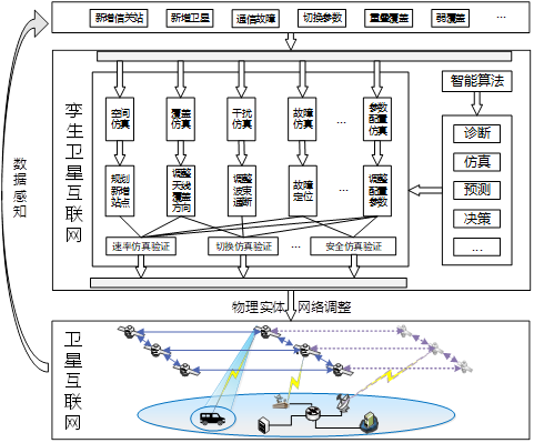 孪生与预测层包含意图解析、智能编排、数字重建、评估预测等重要功能。一方面根据物理实体状态,高效调度存算资源进行模型的编排映射,对实体网络中网元状态、拓扑情况、环境信息等进行高保真模拟,重建全息的卫星互联网系统,同时为应用与决策层提供当前系统的评估数据;另一方面根据应用与决策层的需求意图,编排机理模型,对系统未来状态或行为进行预测,推演最优的决策机制,为系统优化提供依据。