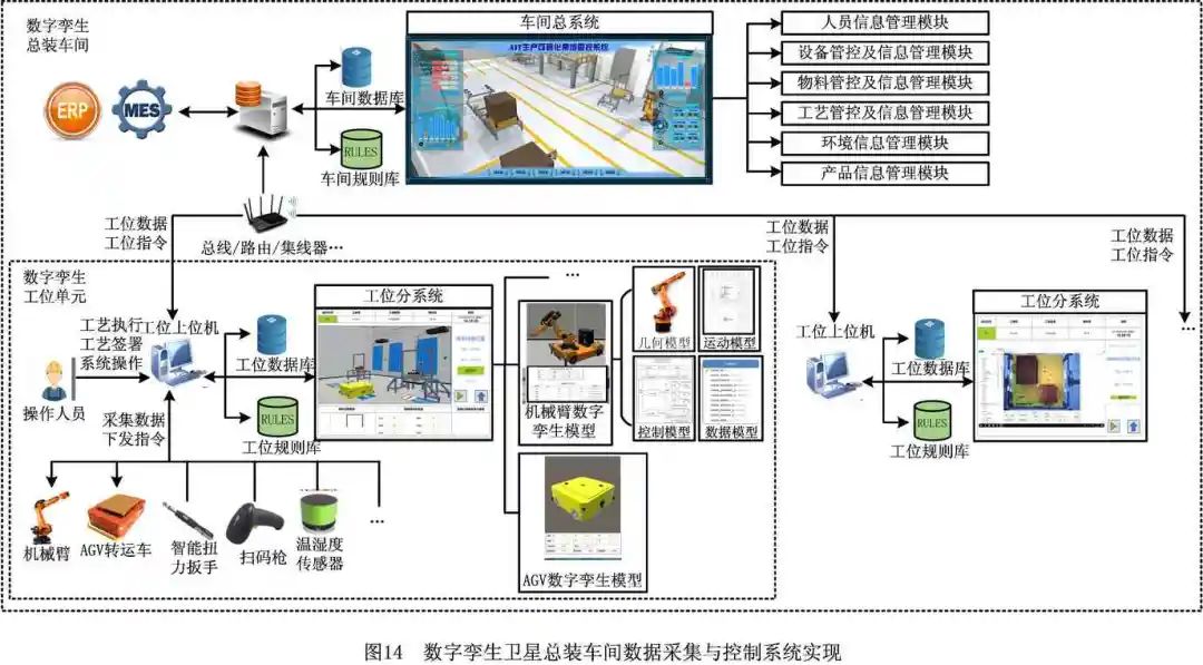 在数据采集与控制系统实现上,对卫星总装过程在线数据采集与传输系统架构进行设计研究并实现各要素数据的实时采集以及部分总装设备的控制。针对卫星总装过程数据多源异构且采集时机与频率各不相同的特点,设计分布式的采集网络架构,研究了软硬件结合的协议处理方法,同时结合边缘计算对每个工装设备和工位的数据进行处理,保证了整个车间数据采集与传输的顺畅,并与上述构建的数字孪生卫星总装车间模型进行关联,实现了基于实时数据驱动的模型运动与更新以及部分总装设备的控制,如图14所示。