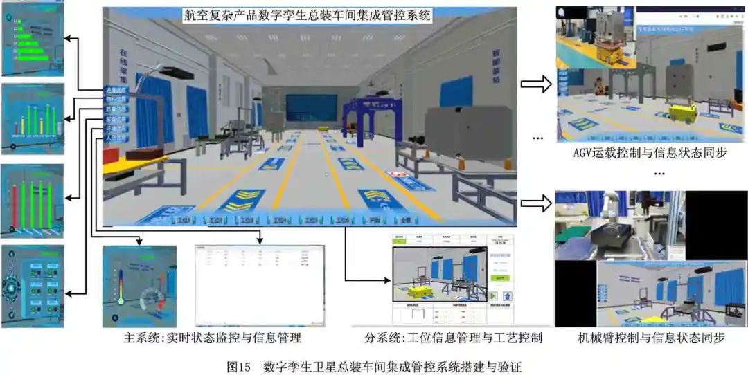 在车间集成管控系统搭建上,基于数字孪生卫星总装车间模型构建、数据采集与控制系统研究,搭建了数字孪生卫星总装车间管控系统。系统集成了上述的虚拟模型、数据库、采集系统以及部分设备(如AGV、机械臂等)的控制系统,实现了对车间各要素的数据实时采集与信息管理、虚拟车间实时同步与状态监控、车间工装设备安全实时控制、车间工艺工单自动处理等功能。研究工作应用在某卫星研制单位卫星总装数字化批量生产验证线中,系统相关功能在具体总装工艺工序中得到验证,为未来进一步开展数字孪生卫星车间工作奠定基础,如图15所示。