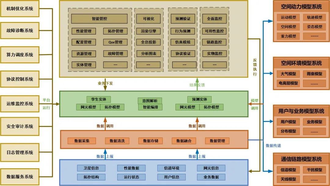 实体层由实际网络系统与物理环境构成,包含节点设备、网络状态的运行监控和管制,以及物理数据的感知反馈。具体包括网元设备信息、用户状态、网络流量、业务分布、路由拓扑、电磁环境、卫星姿轨等。实体层不仅要构建向上反馈,向下执行,可为用户提供全域全时的智联可信网络,还要构建数据采集回传的全息智慧感知网络。