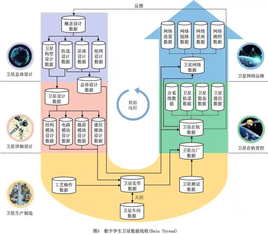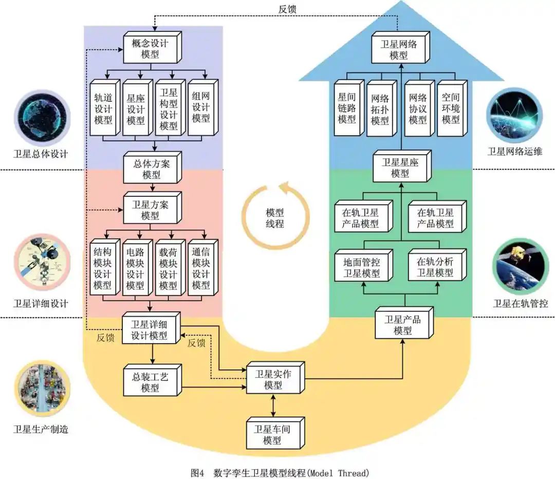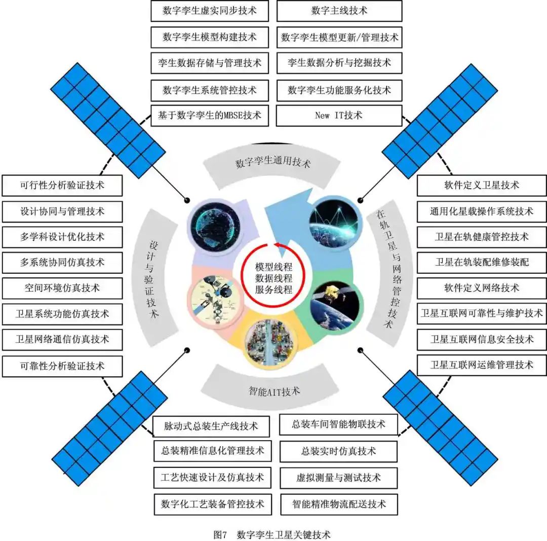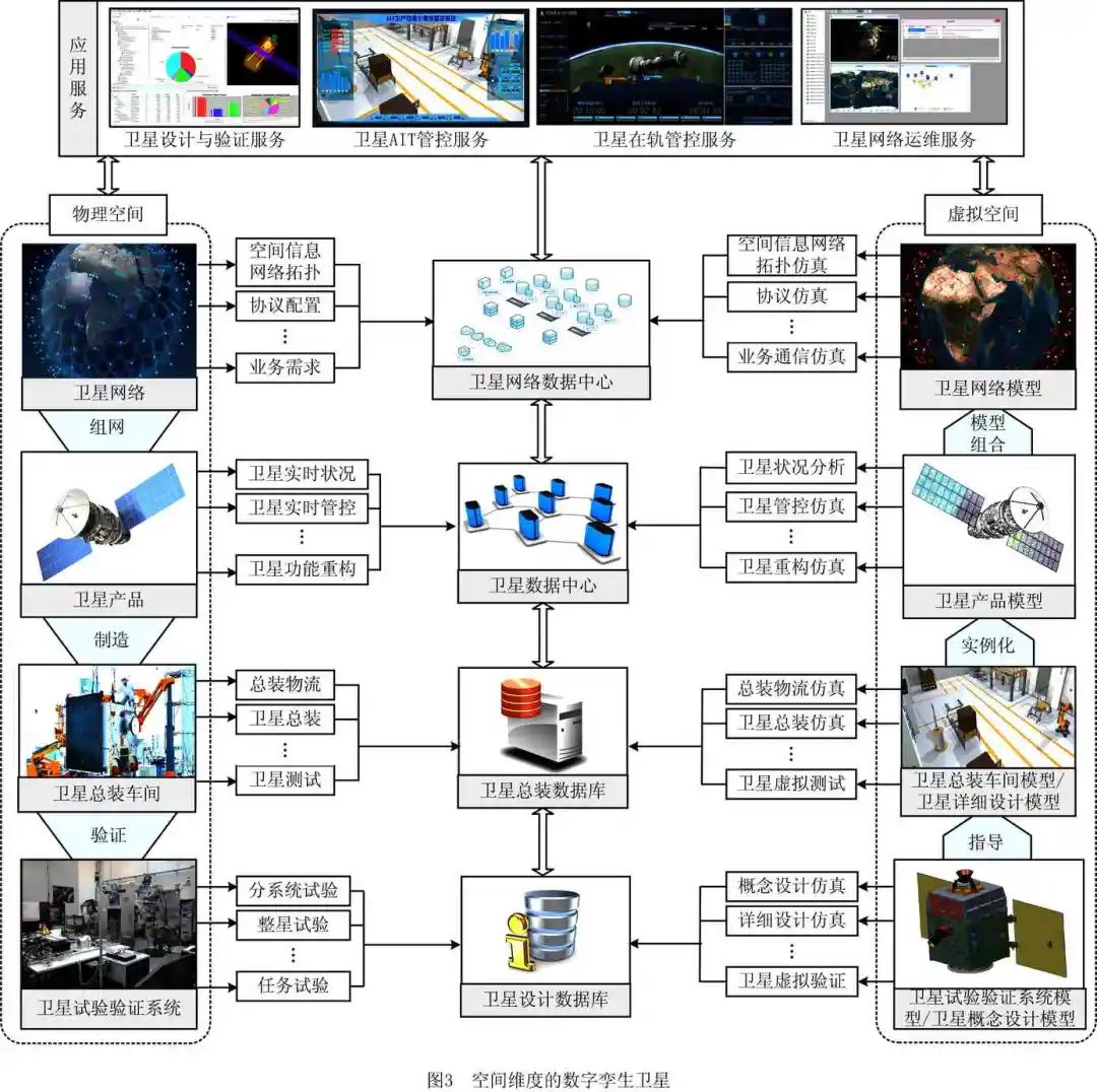 数字孪生卫星是将数字孪生与卫星工程中关键环节、关键场景、关键对象紧密结合,从空间维度上,与试验验证平台、总装车间、卫星产品、卫星网络等对象或场景实时映射,实现更优更快的仿真、监控、评估、预测、优化和控制;从时间维度上,与总体设计、详细设计、生产制造、在轨管控、网络运维等环节真实同步,形成贯穿卫星工程全生命周期的模型线程、数据线程、服务线程,并进而辅助卫星工程各阶段管控与协同。