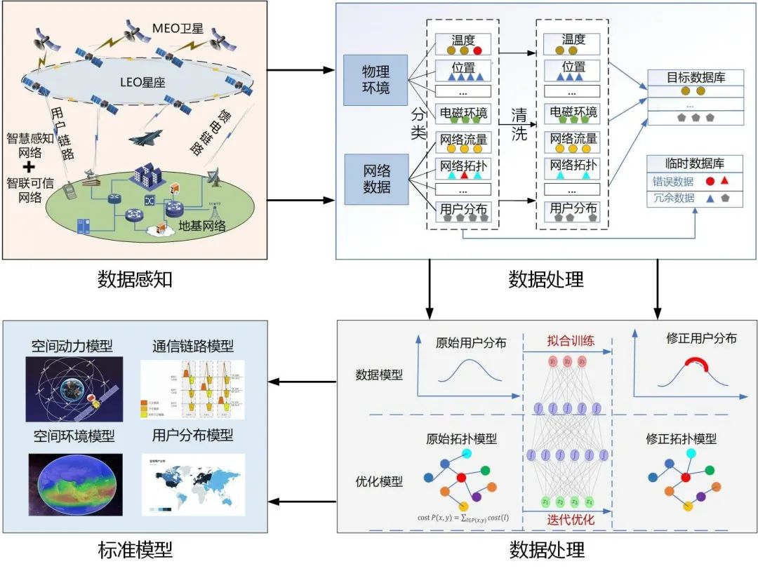 模型根据是否存在物理关系或数学表达,分为机理模型和数据模型。卫星互联网的空间动力模型、通信链路模型等属于机理模型,可以用数学定理或物理公式进行描述;网络实时状态、环境实时情况等属于数据模型,主要由感知系统统计反馈。卫星互联网的空间环境复杂、用户业务分布不均,且系统具有时变性,单一使用机理模型或数据模型建模,难以满足日益复杂的系统特征。通过大规模数据与机理的融合驱动,一方面对感知数据进行纠偏,另一方面对已有的机理模型进行迭代演进,形成标准化模型,如用户分布模型、业务分布模型、资源分配模型与网络路由模型等。基于标准模型的孪生系统不仅可以高保真地还原系统状态,还能对未来系统行为预测推演。机理与数据双驱动的标准化模型建立过程如图3所示。