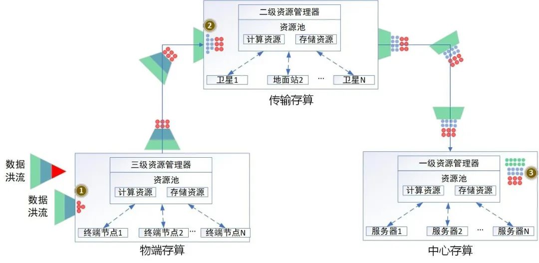 通过对智能物端、传输网节点和处理中心的存算资源进行多级资源虚拟池化,将数据洪流分级引流,将有效保障系统的平稳运行。