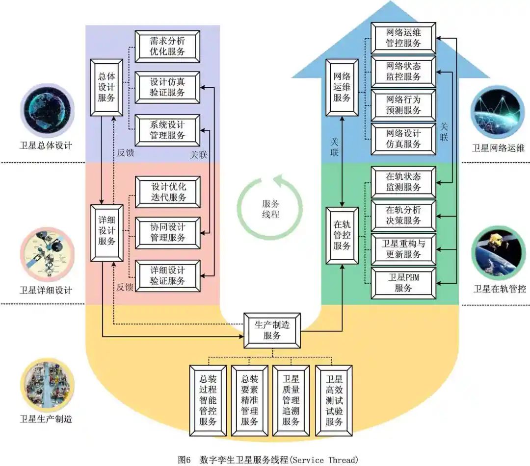 具体包括:①在卫星总体设计和卫星详细设计阶段,通过数据线程挖掘全生命周期数据以进行设计优化,并与MBSE等技术结合,借助模型线程的模型转换、数据线程的数据调用、服务线程的服务协作以及数字孪生卫星验证系统,辅助卫星总体与产品详细的概念设计、设计协作以及试验验证,从而提升设计的质量与效率;②在卫星生产制造阶段,基于数字孪生车间等理论,将数字孪生与总装车间、信息系统结合,同时借助模型线程和数据线程打通与设计环节的信息壁垒,建立卫星设计—验证—总装—集成—测试全流程的系统工程,并对实际生产制造进行实时的监控、管理、优化、控制,以应对卫星制造的需求多样化、快速批量化、智能柔性化趋势;③在卫星在轨管控和卫星网络运维阶段,基于模型线程、数据线程、服务线程,实现了物理卫星与卫星星座系统间模型、数据、服务的转换与调用,同时与物理卫星及卫星星座系统实时映射,并借助软件定义技术、PHM技术等,增强信息空间反映、优化、控制、管理物理卫星及卫星星座系统的能力。