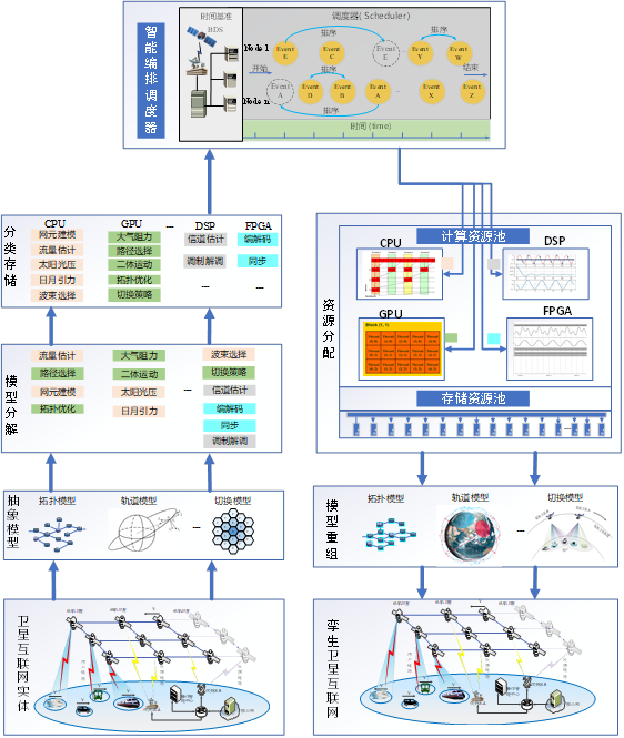 以移动性管理中的切换问题为例,智能编排调度首先需要根据拓扑模型、轨道模型和切换模型等的子模型对CPU、GPU、DSP和FPGA等算力类型的需求,将模型进行分解单体化,同时做好算力需求类型标识。其次为便于编排器快速调度,需要将做好算力需求标识的子模型进行分类存储。然后基于分布式的编排调度器在时间基准器(例如铷钟、北斗系统)的驱动下,将子模型以事件的形式按正确时空顺序调度到计算资源池的不同算力处理器中处理。例如将波束选择分配给CPU处理,将大气阻力子模型分配给GPU进行运算加速,将调制解调分配给DSP完成,将编解码分配给FPGA加速,同时要为子模型正确调度存储资源池中的数据或者其他子模型处理后的数据来完成建模。最后将各个子模型得到的结果,通过模型重组与映射来实现卫星互联网的孪生重建。