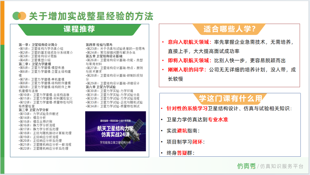 错过《开学季-航天卫星结构工程师入门第一课》直播的朋友,可点击文尾月阅读原文查看,回顾完整内容,获取行业趋势、求职技巧等干货。若想系统提升仿真分析、结构设计能力,推荐报名星卓讲师的《航天卫星结构设计与力学仿真实战24讲:HyperMesh/Patran/Nastran全流程实战教学》课程,通过“理论+实操”的学习模式,快速掌握核心技能,为职业发展打下坚实基础。