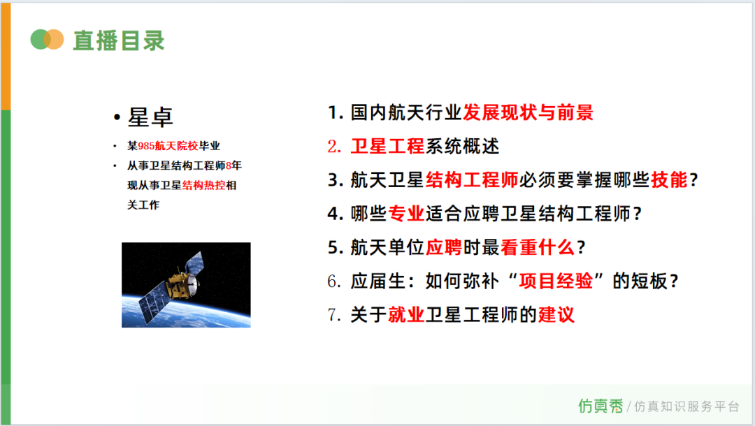 九月开学季,也是校园招聘的黄金时期。对于有志投身航天事业的学子,以及渴望转行进入卫星领域的职场人而言,如何精准把握行业趋势、明确职业发展路径、弥补自身短板,成为突破就业壁垒的关键。为此,仿真秀特别邀请某985航天院校毕业、拥有8年卫星结构工程经验的星卓讲师,带来《开学季-航天卫星结构工程师入门第一课》直播分享,从行业现状、岗位技能到求职策略,全方位拆解卫星结构工程师的成长路径。