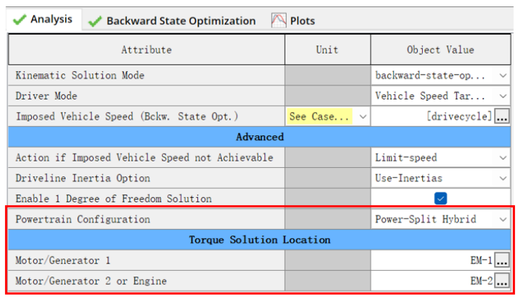 如下图所示,在车辆运动学模板(VehKinemAnalysis)中,首先要选择动力总成的架构形式(Powertrain Configuration),本文选择功率分流架构(Power-Split)。用户还可以选择串并联(Parallel- Series Hybrid)和其他(Others)。其中Others包含比如P2,EV等架构。