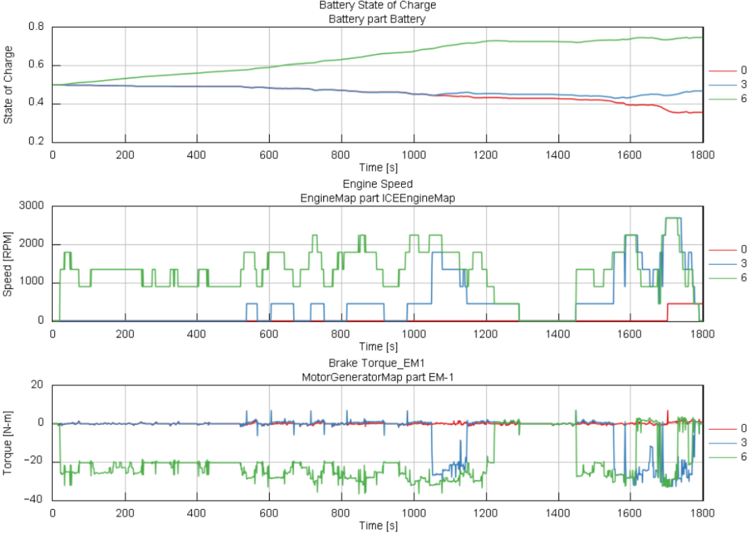 我们测试了不同的等效因子:0、3、6。SOC的惩罚区间为0.3-0.7。下图为SOC,EM1的转速以及发动机转速。从图中可以看出当等效因子为0时,表示电非常便宜,故该车将仅工作在EV模式,发动机转速为0。随着等效因子的增加,EM1的制动扭矩越来越大。