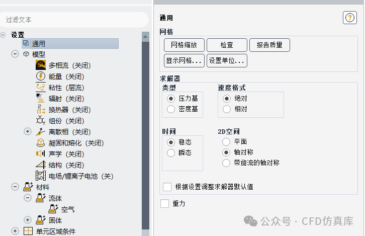 首先导入网格,然后勾选为稳态计算,并选择压力基求解器。并选择轴对称选项。