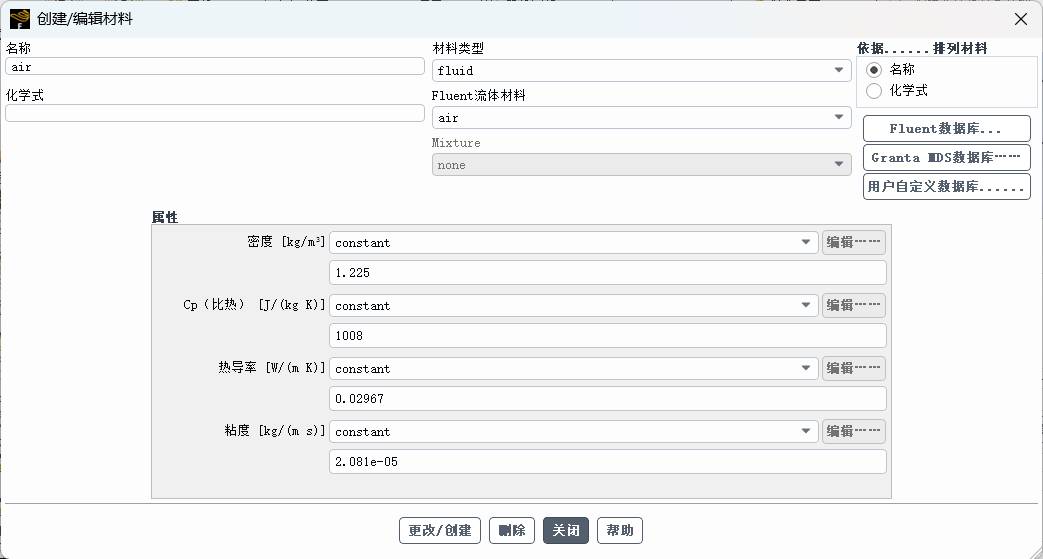 依据相关文献中尔等数据,对材料进行设置,密度为1.225kg/m^3,比热为1008,热导率为0.02967,粘度为2.081e-5,相关设置如下如所示: