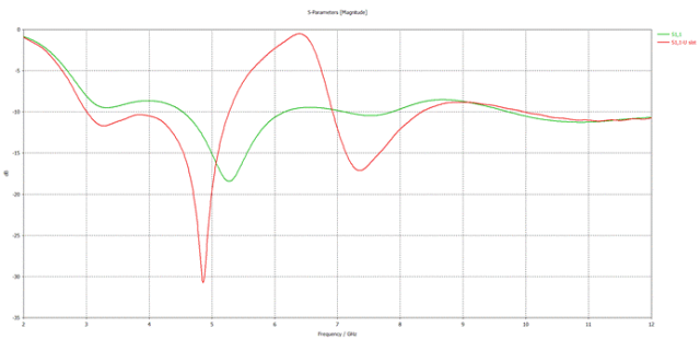 注:绿线为挖槽之前的S11参数,红线为挖槽之后的S11