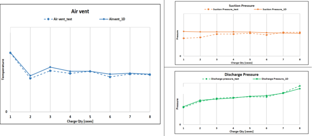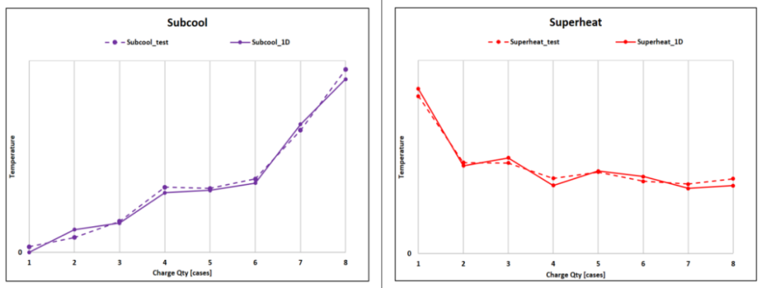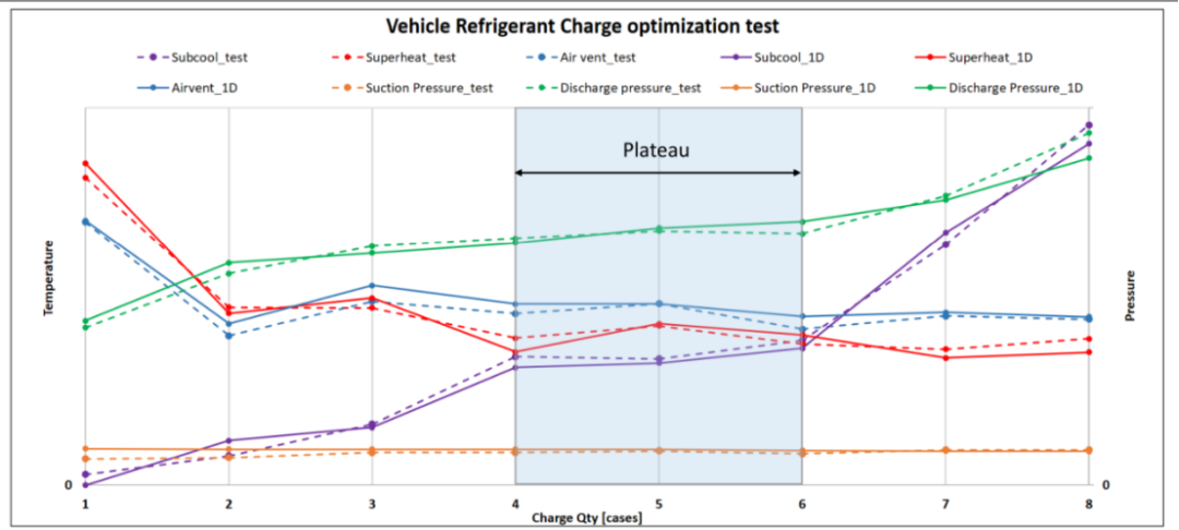 通过仿真初始计算在相应的制冷剂充注量下形成平台,下图实线为仿真,虚线为试验值,结果表明精度很好。