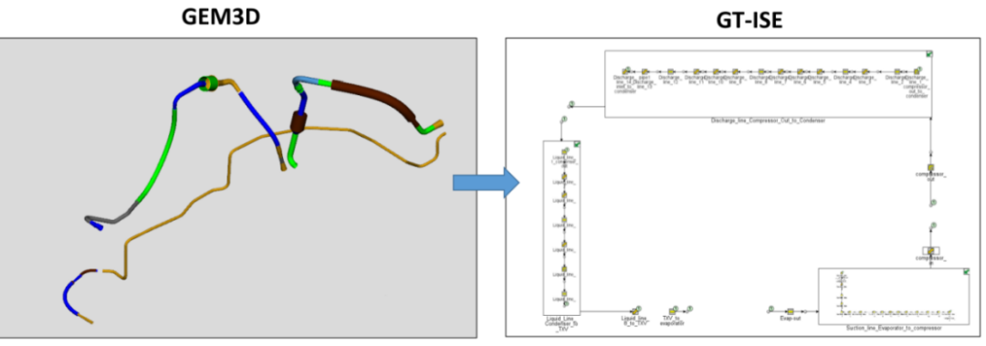 空调系统管路建模,通过GEM3D工具将实际管路几何转换为一维模型。
