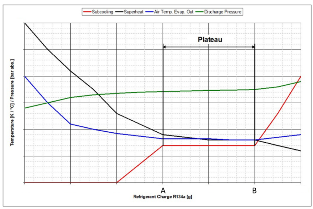 以上三种方法,平台法是确定制冷剂充注量最常用的方法,下图展示了过冷度、过热度、出风口温度和排气压力在两个充注量之间形成一个稳定平台。