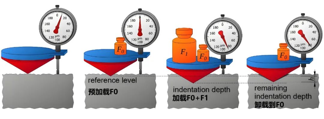 3) 施加试验力F1,叠加预紧力F0,总压力F=F0+F1,压入材料。