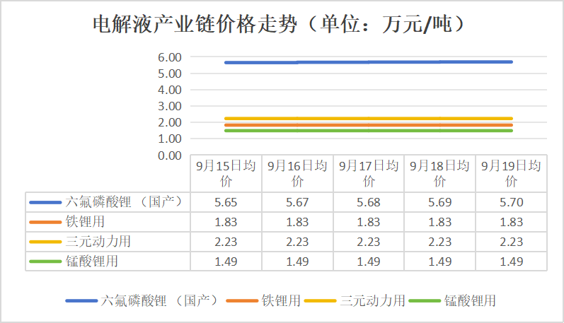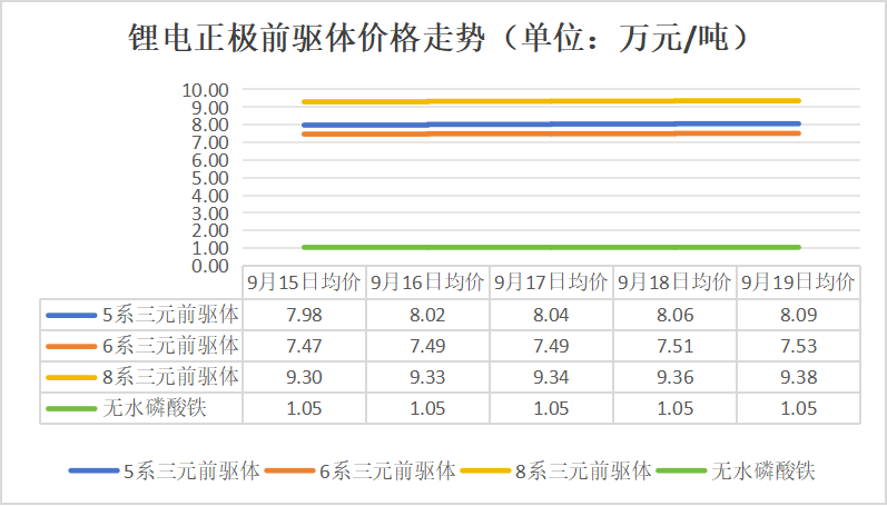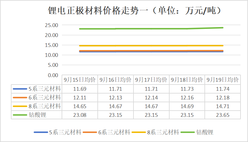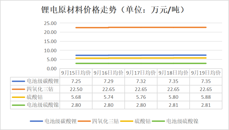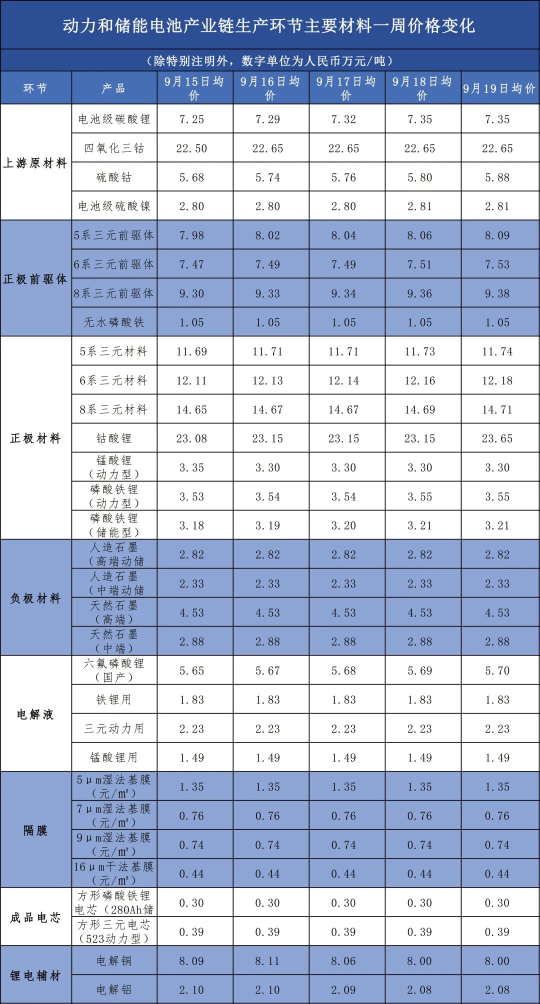 2025年9月15日-9月19日,电池级碳酸锂、硫酸钴、5/6/8系三元前驱体、5/6/8系三元材料、储能型磷酸铁锂、六氟磷酸锂(国产)价格持续上涨;四氧化三钴、电池级硫酸镍、钴酸锂、动力型磷酸铁锂价格有所上涨;动力型锰酸锂、电解铝价格有所下跌;电解铜价格先涨后跌;无水磷酸铁、铁锂用/三元动力用/锰酸锂用电解液、负极材料、隔膜、成品电芯价格保持稳定。