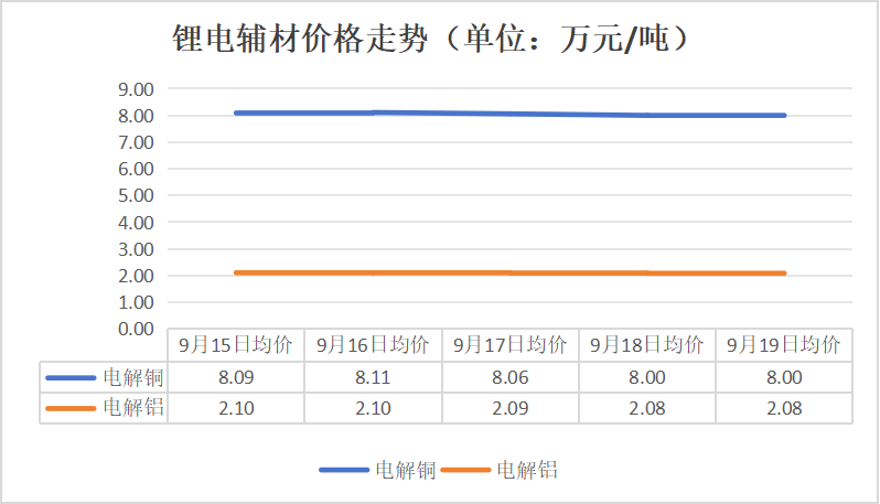 从锂电辅材来看,电解铜价格先涨后跌,于9月16日上涨至8.11万元/吨后,开始出现下跌,周末比周初下跌了0.09万元/吨;电解铝本周价格有所下跌,在17日、18日分别下跌了0.01万元/吨,周末比周初价格下跌了0.02万元/吨。