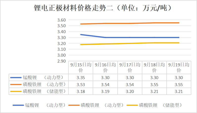 本周,动力型锰酸锂价格有所下跌,于15日下跌了0.05万元/吨,其他时间价格保持稳定,周末比周初下跌了0.05万元/吨;动力型磷酸铁锂价格有所上涨,16日、18日均上涨了0.01万元/吨,周末比周初上涨了0.02万元/吨;储能型磷酸铁锂价格持续上涨,几乎一天一个价,在16日-18日均上涨了0.01万元/吨,周末比周初下跌了0.03万元/吨。